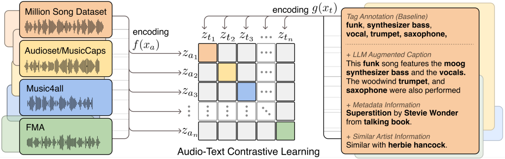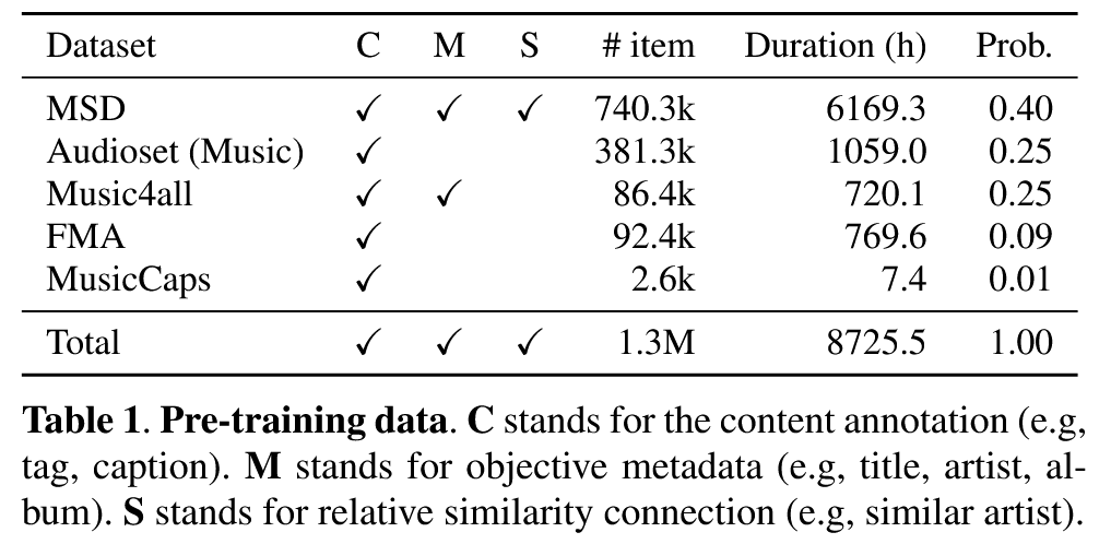 进一步使这一综合评估复杂化的是缺乏包含内容描述、metadata 和相对相似性知识的大规模音乐文本配对数据集。